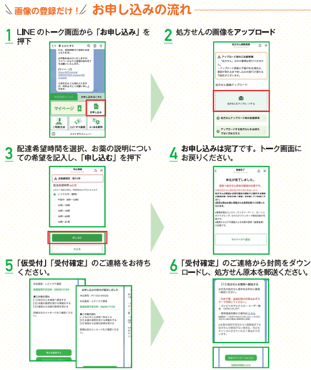 2. LINE登録・処方せん送信 & お受け取り:LINE登録に病院で処方せんをもらったら、LINEで写真を送るだけ。ビデオ通話で薬剤師の説明を受け、お薬は宅配便で届きます。