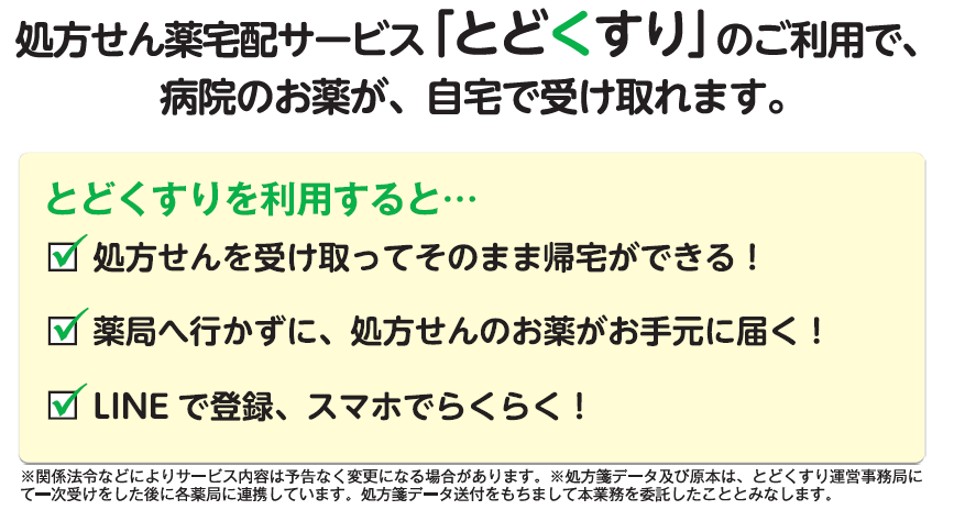 「とどくすり」は、薬局に行かずに自宅でお薬を受け取れるサービスです。